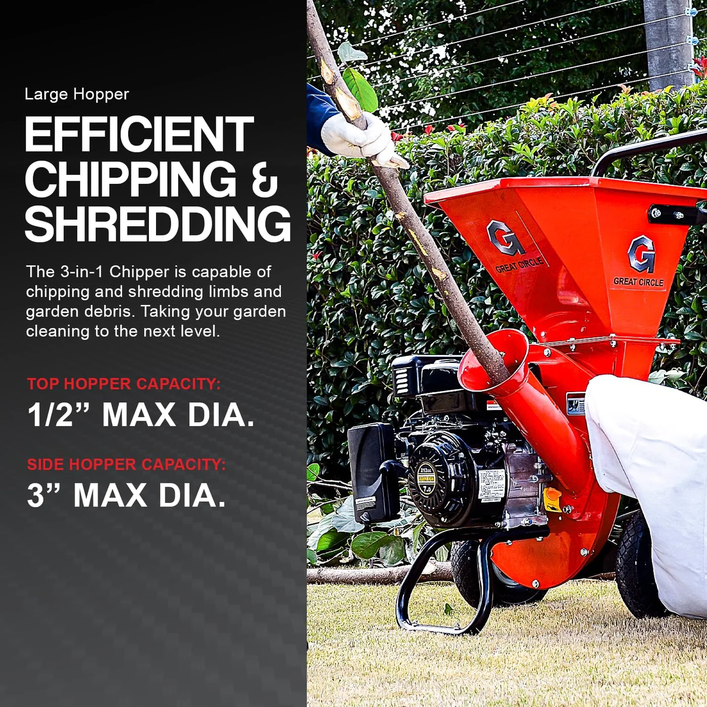 GreatCircleUSA 3-in-1 Wood Chipper – 7HP Engine, 3″ Max Branch Capacity